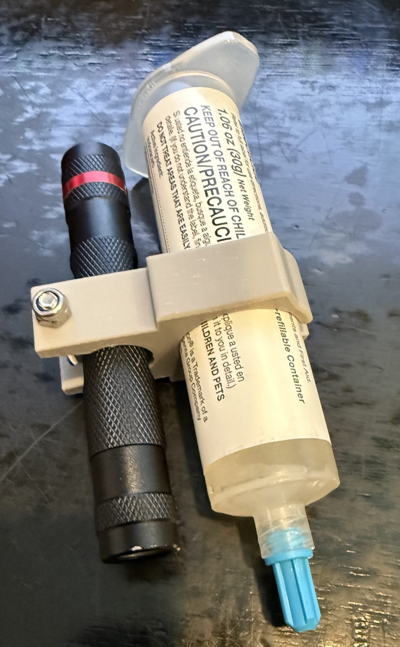 Penlight Flashlight holder for mounting on common bait tubes. Works with bait guns as long as there is sufficient clearance. Designed for Bait Tubes with a 25mm or approximately 1 inch diameter. Designed for a Coast G19 or G20 penlight, but compatible with penlights that are 15.8mm or 5/8″ in diameter. When used with a Coast G19 the flashlight, AAA battery, Mount and hardware weigh approximately 1.5 oz. Designed to be installed on the bait tube to put light where you need it while doing crack, crevice and void bait applications. Made from a durable, UV and Heat resistant plastic.